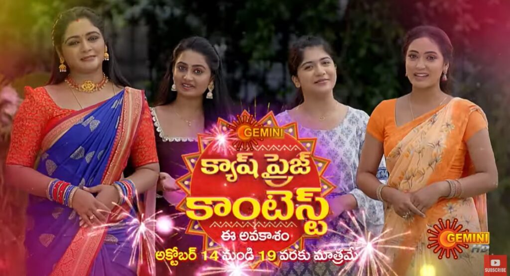 Watch Gemini TV serials Cash Prize Contest Abhinandana, Maa Inti Devatha, Sneham Kosam. This contest will run from 14 Oct to 19 Oct 2024 @ 1.00 PM to 2.30 PM.