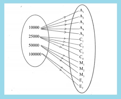 A company has four categories of employees given by Assistants (A), Clerks (C), Managers (M) and an Executive Officer (E). The company provide ₹10,000, ₹25,000, ₹50,000 and ₹1,00,000 as salaries to the people who work in the categories A, C, M and E respectively. If A1, A2, A3, A4 and As were Assistants; C1, C2, C3, C4 were Clerks; M1, M2, M3 were managers and E1,E2 were Executive officers and if the relation R is defined by xRy, where x is the salary given to person y, express the relation R through an ordered pair and an arrow diagram.